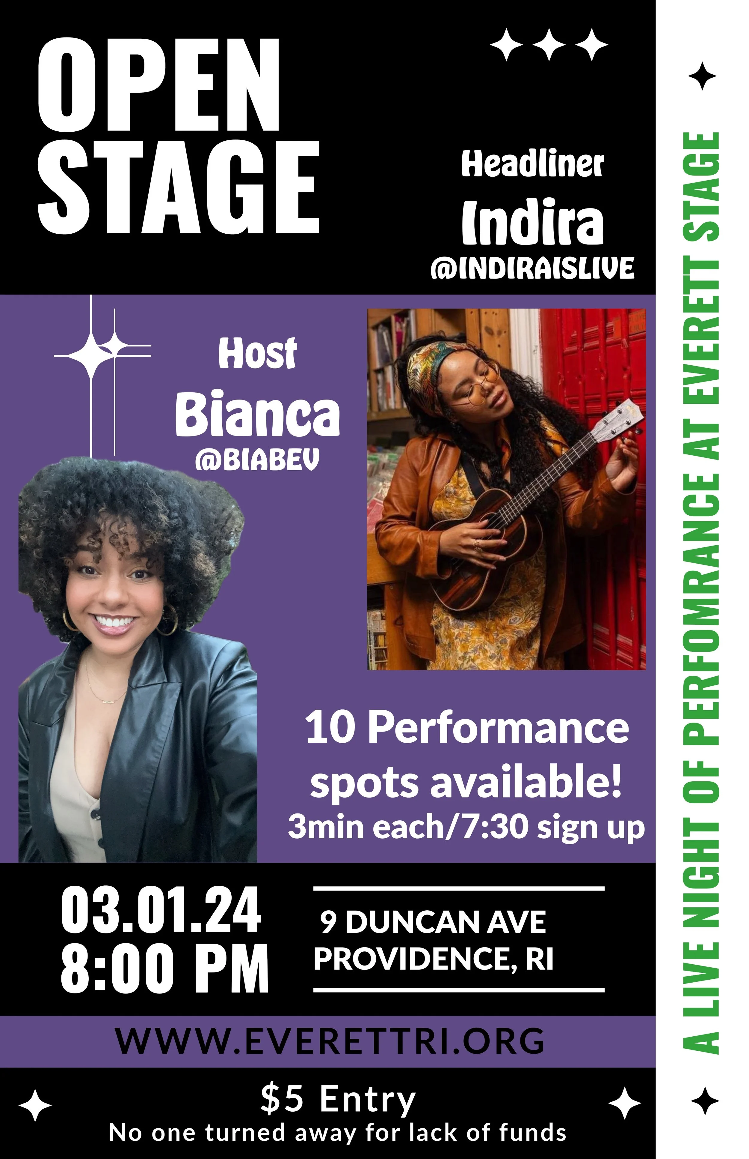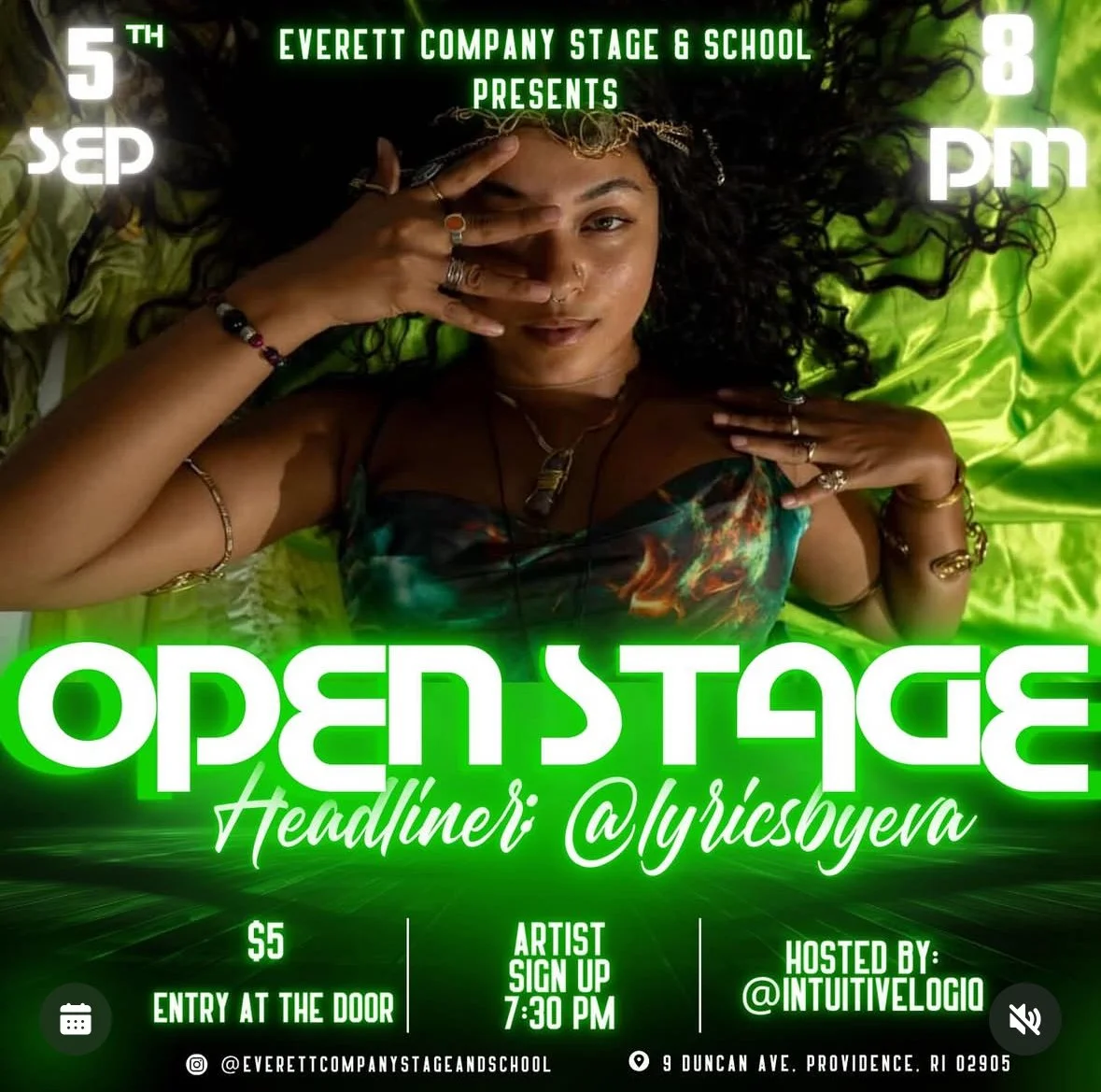 We are honored to welcome Ashanti Eva Davenport or @Lyricsbyeva back to Everett Stage and this time... as headliner!! A true supporter of our community, Eva has graced Open Stage many times - sharing her voice, her heart, and her growth with us along the way. Come witness her full circle moment as she headlines with an incredible performance filled with music, dance and a beautiful voice. Let's fill the room with love, creativity and community - Just like Eva always does.