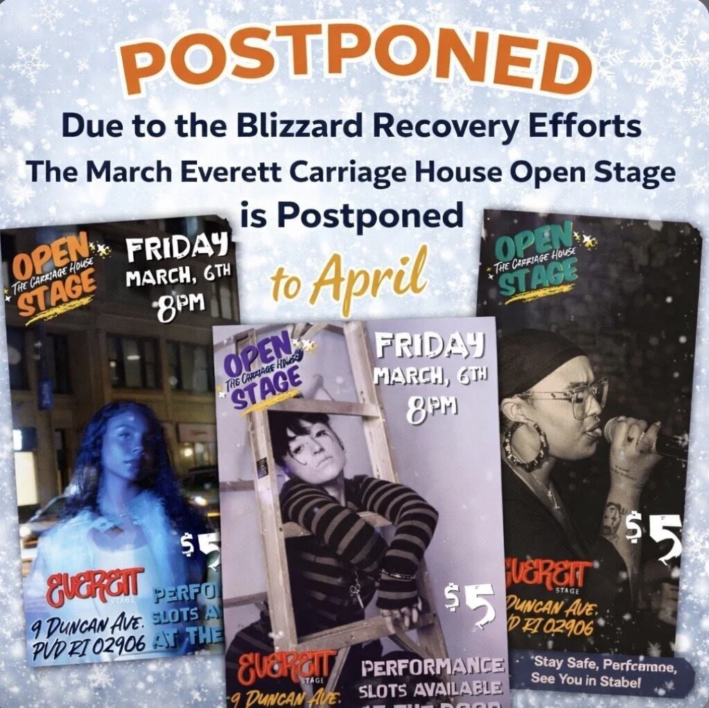 Due to the recent blizzard and the continued snow recovery efforts, we've made the difficult decision to cancel our March 6 Open Stage. While the snow is being cleared, we don't believe there will be enough safe and accessible parking available for our artists and audiences - and your safety always comes first.